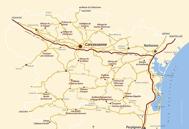 This is the region we visited this year, staying at Alet-les-Bains, visiting the villages of Arques (home of Deodat Roche), Fanjeaux, (see Arthur Guirdham and St Dominic) and the fortified town of Minerve, and the Chateaux of Queribus, Peyropertuse, Termes and Villerouge and to the east of this map, Montsegur. (Previous visits in the Ariege and Couserons regions). We also stayed one night in Carcassonne.